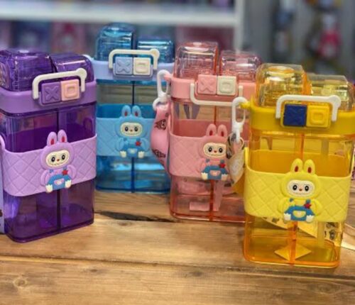 500ml bus-shaped water bottle Typically featuring moving wheels, a shoulder strap, and a straw for drinking.