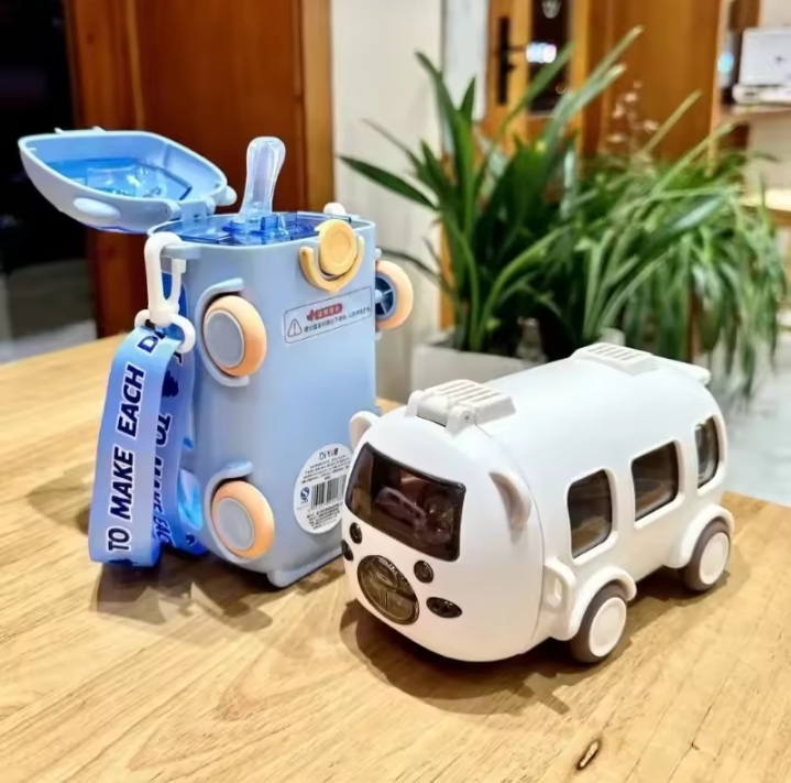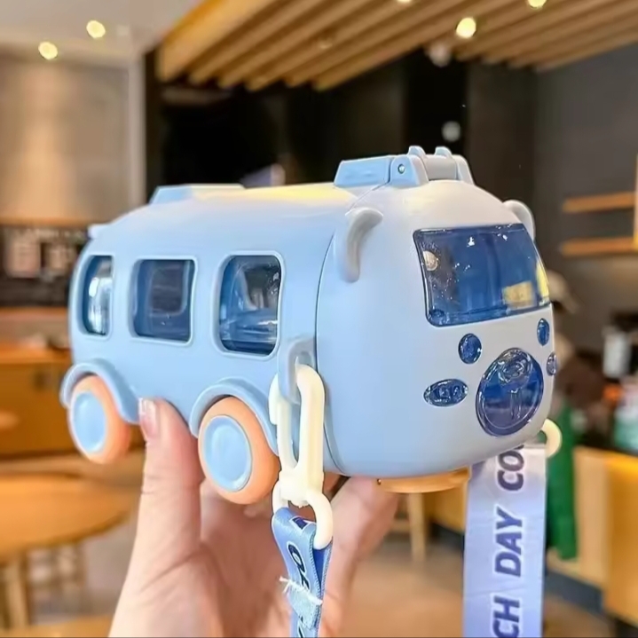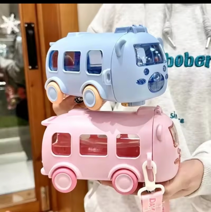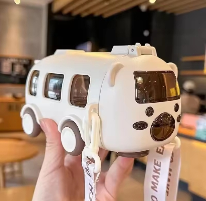 April 18, 2026500ml bus-shaped water bottle Typically featuring moving wheels, a shoulder strap, and a straw for drinking.