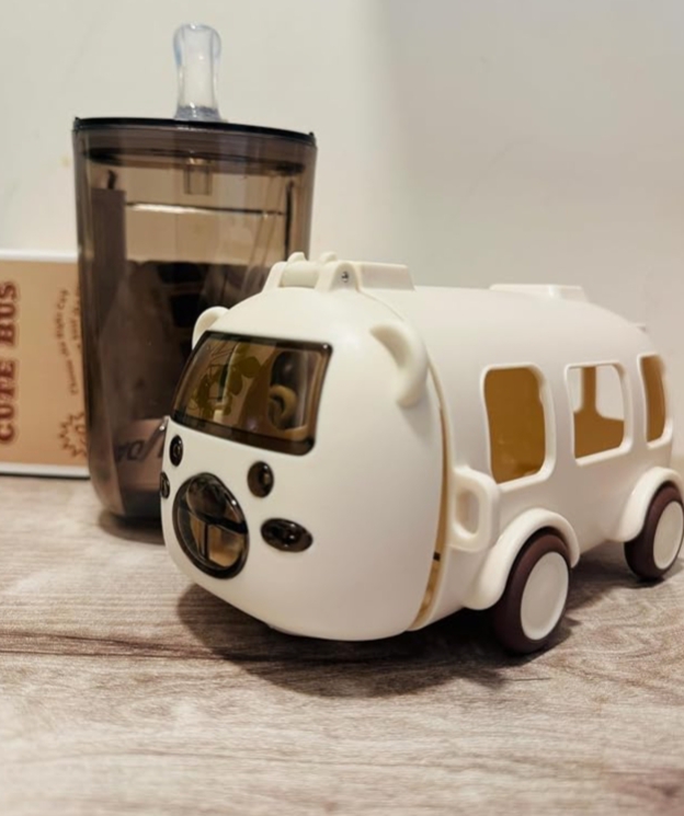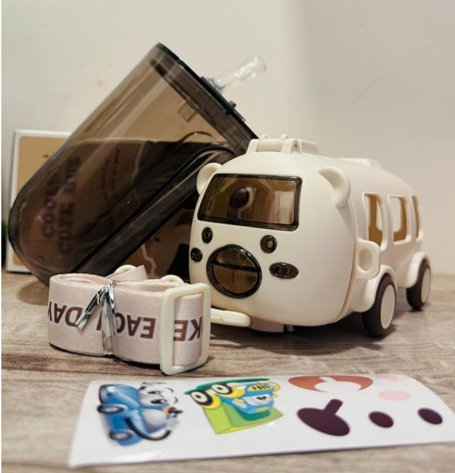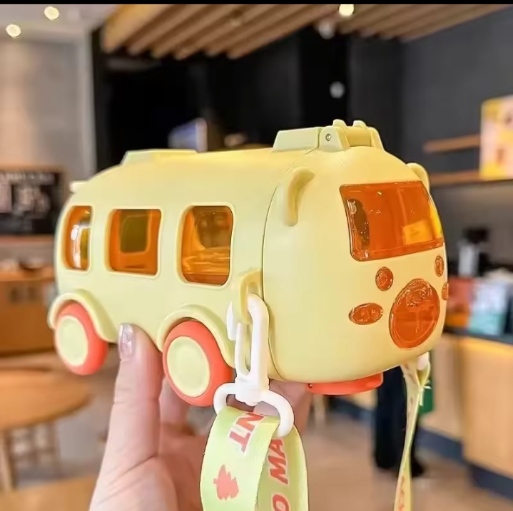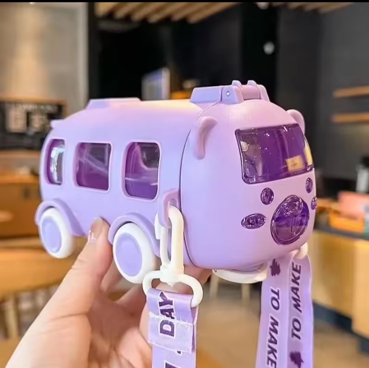 This item is a 500ml bus-shaped water bottle designed for kids, typically featuring moving wheels, a shoulder strap, and a straw for drinking.