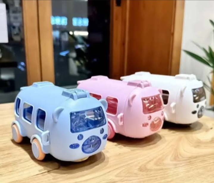 - Design: Features a bus shape with functional moving wheels